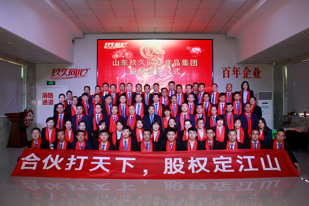 “合伙打天下,股權(quán)定江山!”山東玖久同心食品集團股權(quán)簽約儀式在唐王生產(chǎn)基地隆重舉行。在股改專家和特邀嘉賓的共同見證下,首批70多位為企業(yè)發(fā)展做出重要貢獻的優(yōu)秀員工現(xiàn)場簽署股權(quán)協(xié)議,正式實現(xiàn)了由員工成為股東的蛻變。本次股權(quán)激勵機制的成功落地,對于玖久同心來說具有里程碑式的劃時代重大意義,必將會在集團發(fā)展史上留下濃墨重彩的一筆!